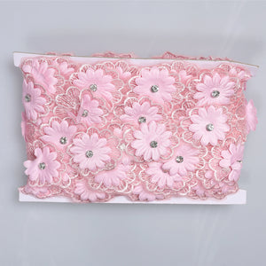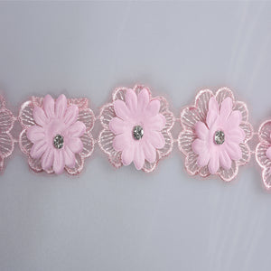 Bordură elegantă pe tull , decorată cu flori 3D din material textil și broderie fină. Fiecare floare are în centru un cristal strălucitor, care adaugă un efect luminos și rafinat. Modelul combină petale satinate cu detalii brodate, oferind un aspect plin, armonios și feminin.