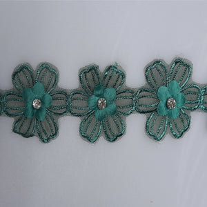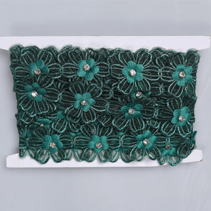 Bordură delicată pe bază de tull , decorată cu flori mici din material textil, fiecare având în centru un cristal transparent pentru un plus de eleganță. Designul este ușor, aerat și foarte feminin, cu petale brodate care creează un efect floral continuu și armonios.